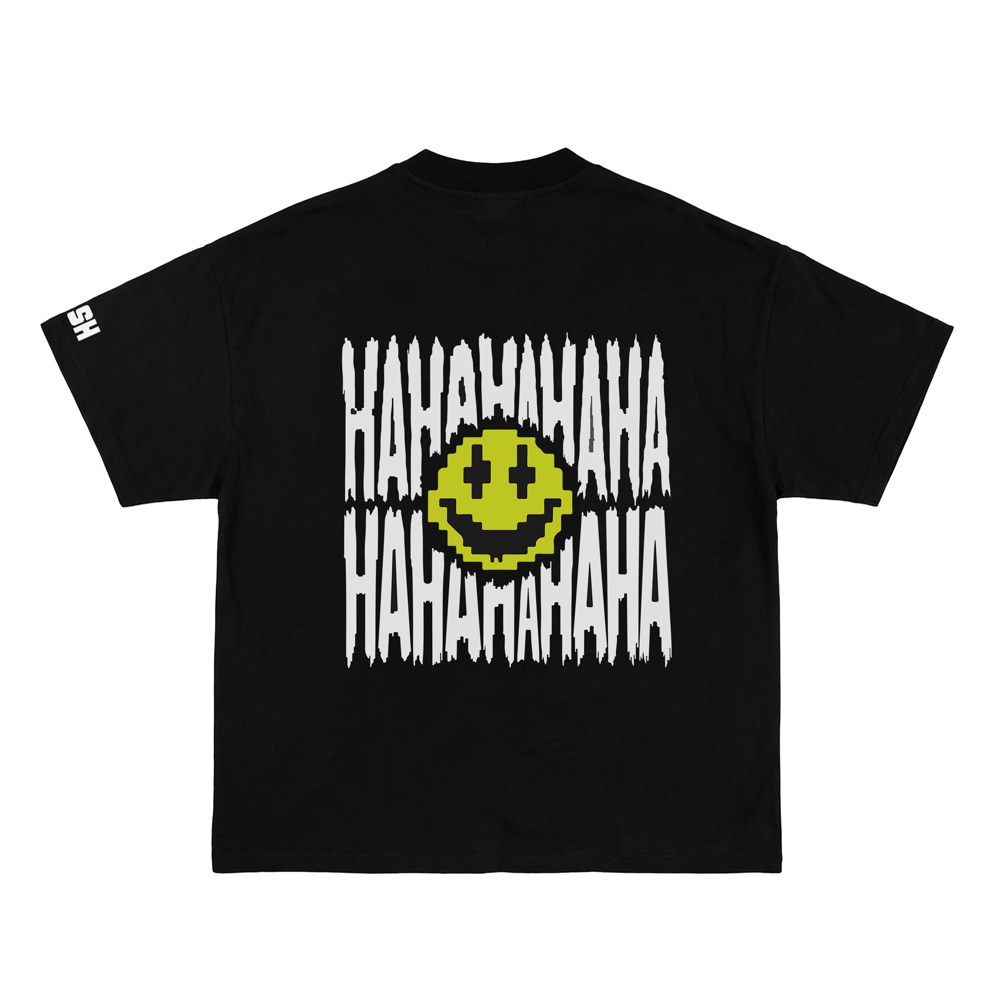 The HAHA Black Oversized T-Shirt brings a bold, rebellious edge to your streetwear lineup. Featuring a detailed skull with gold lightning bolts on the front and a distorted “HAHA” graphic with a pixelated smiley on the back, it’s crafted from premium cotton for lasting comfort and urban appeal.