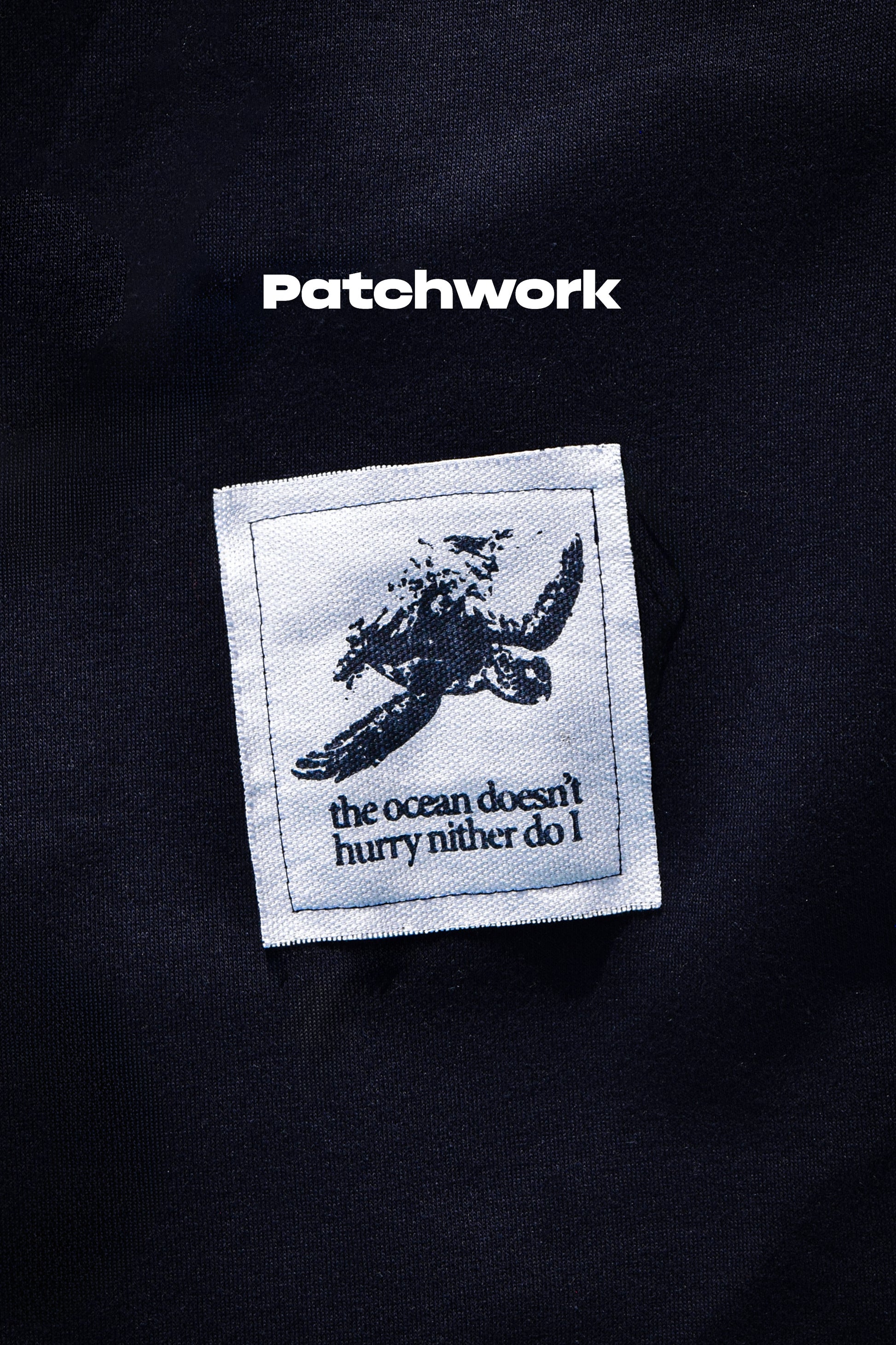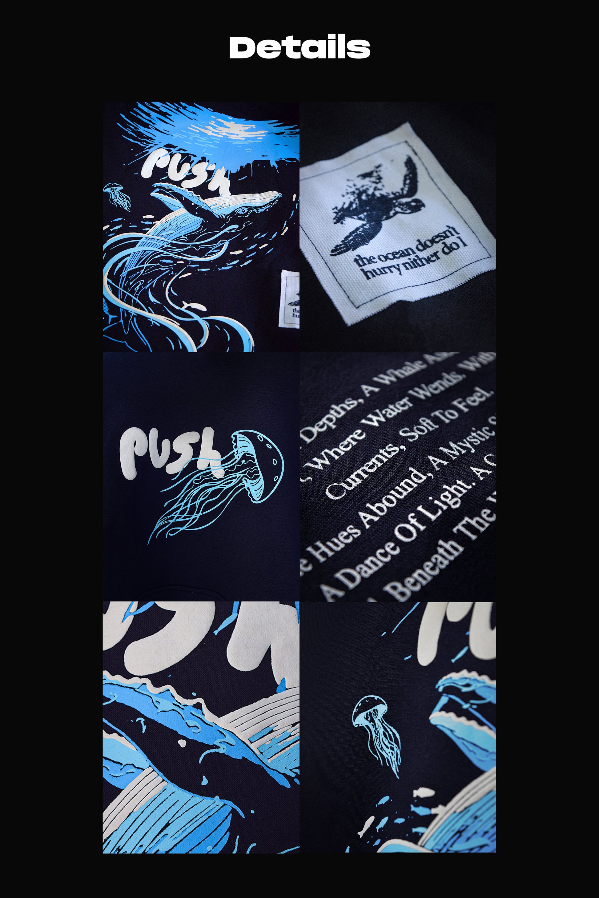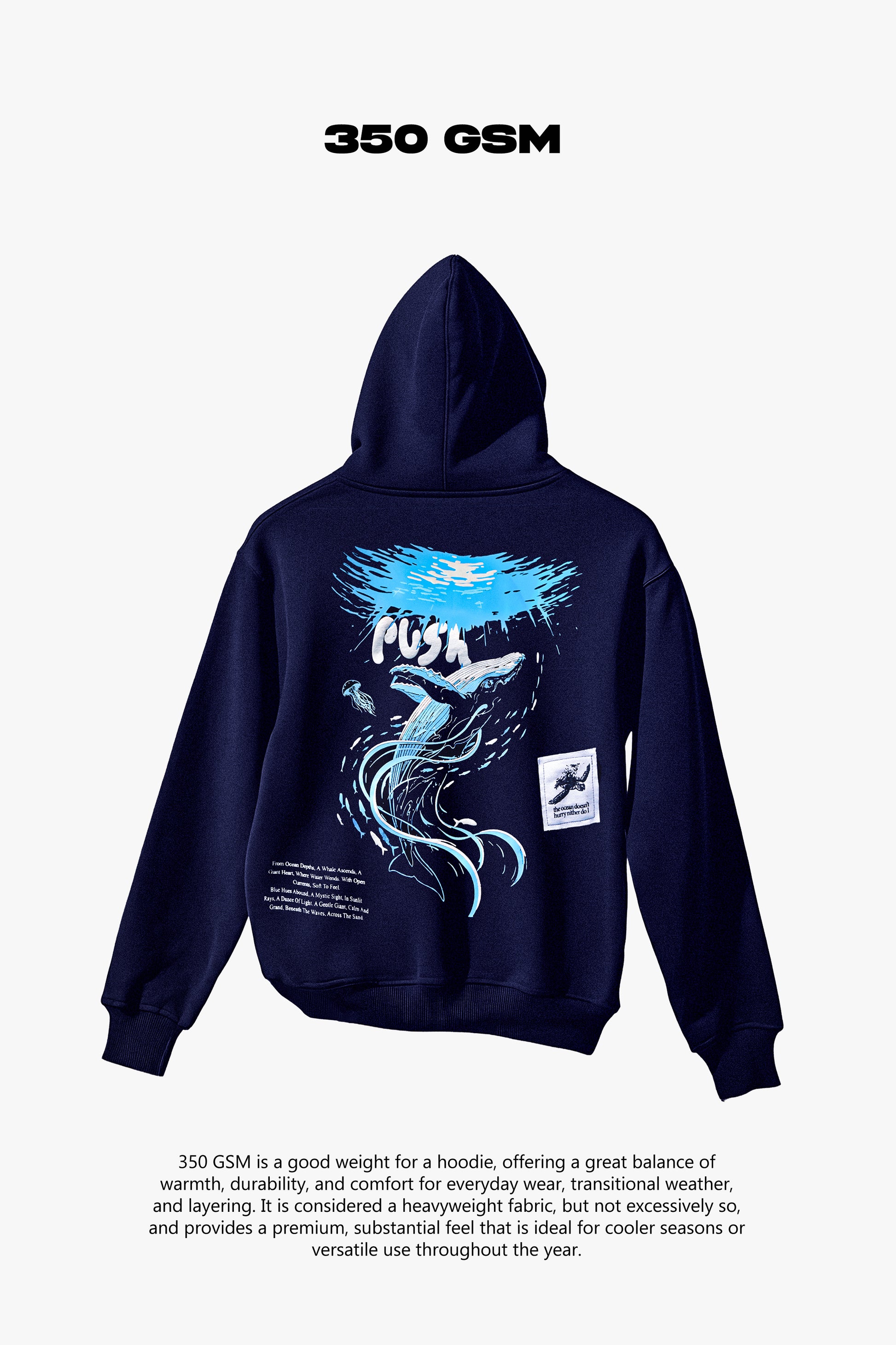 The hoodie in midweight 100% cotton fleece, 350 GSM with a soft fabric. Designed with a jersey-lined drawstring hood, dropped shoulders, long sleeves, and a kangaroo pocket. Features wide ribbing at the cuffs and hem for structure. The back showcases a bold whale-inspired graphic with puff and screen printing, symbolizing depth and movement, enhanced by patchwork details for a distinctive finish.