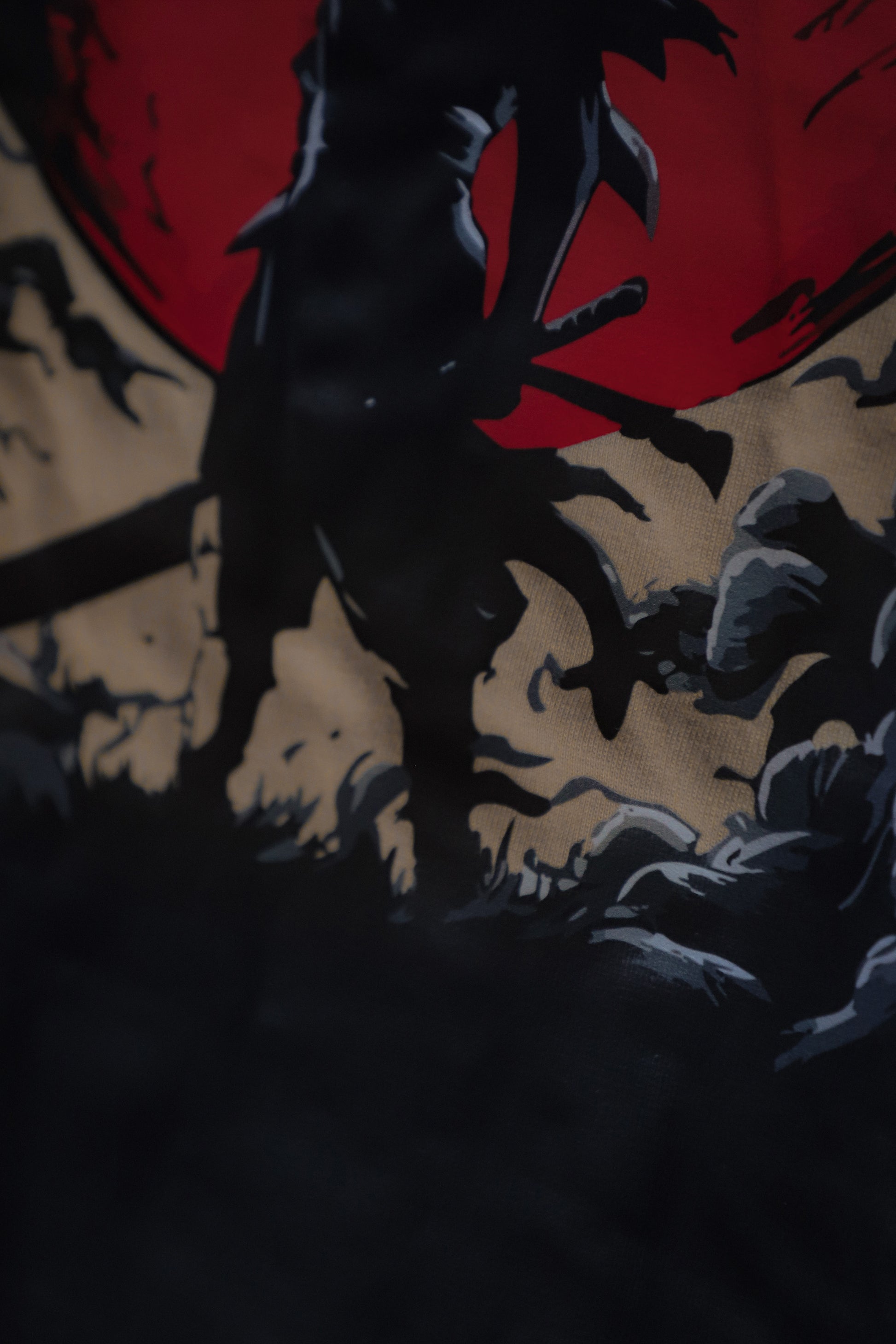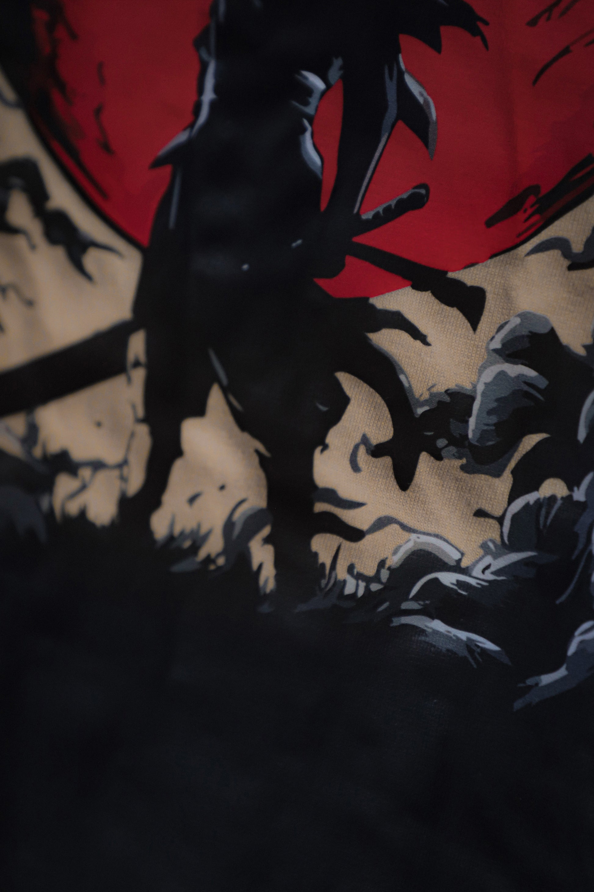 - Back Print: Striking red sun backdrop with a lone samurai surrounded by shadows — a powerful statement of resilience and strength.